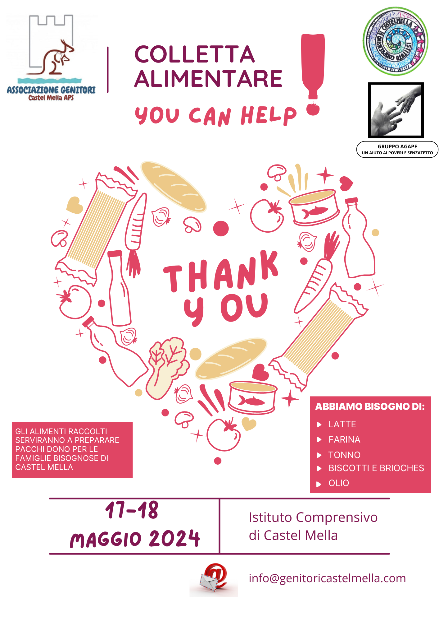 Venerdì 17 e sabato 18 maggio verranno raccolti alimenti per preparare pacchi dono per le famiglie bisognose di Castel Mella.